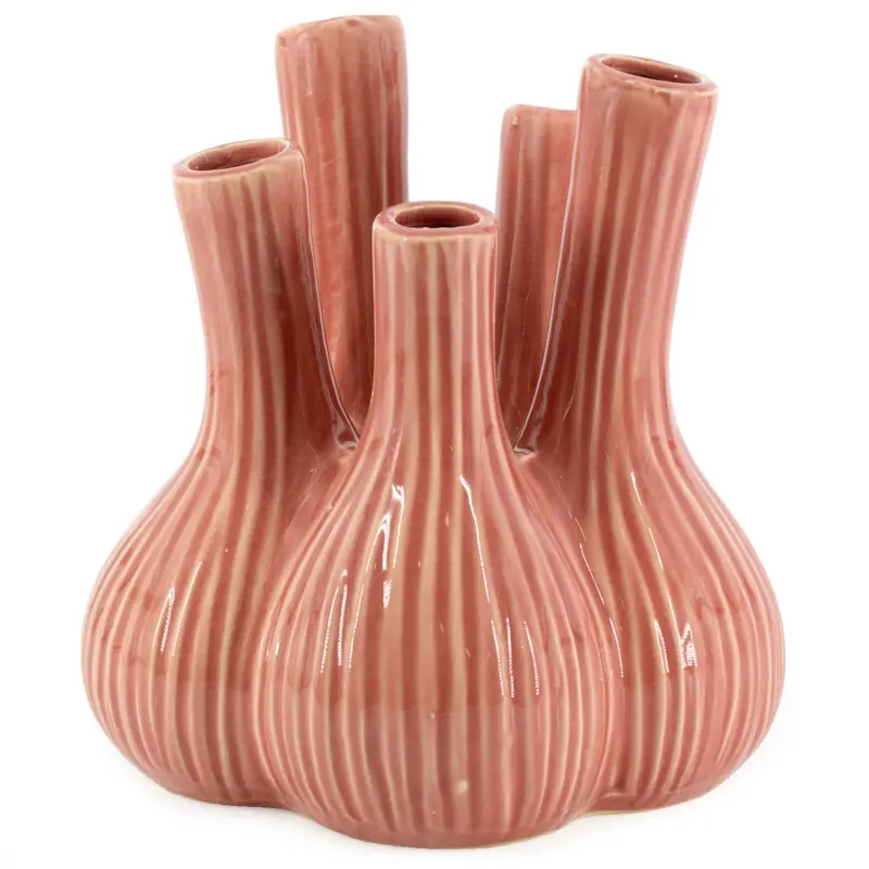 Geef je bloemen de aandacht die ze verdienen met de unieke Keramiek Tulpenvaas Knoflook in een stijlvolle roze tint. Deze vaas heeft een speels ontwerp geïnspireerd op een cluster knoflookbollen, waarbij elk van de vijf halzen ruimte biedt voor je favoriete tulpen of losse bloemen. Een echte blikvanger met een organisch karakter.