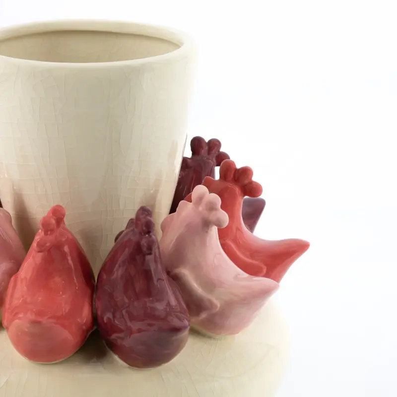 Deze vaas is vervaardigd van kwalitatief aardewerk. Wat direct opvalt, is het contrast tussen de rustige beige vaas en de levendige kleuren van de kippen. De details van de vogeltjes zijn zorgvuldig afgewerkt met een glanzende finish, waardoor ze prachtig oplichten bij natuurlijk daglicht. Met een diameter van 25,7 cm en een hoogte van 23,5 cm heeft de vaas een robuust maar elegant formaat.