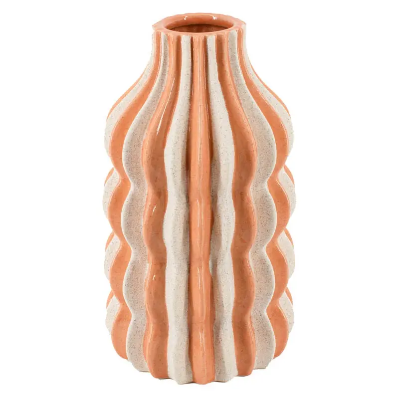 Geef je interieur een kleurrijke en artistieke boost met de Vaas Stripes Sandstone. Deze opvallende keramieken vaas combineert een speels streeppatroon in oranje en wit met een unieke, golvende textuur. Met een indrukwekkende hoogte van 38 cm is dit de perfecte blikvanger voor op je eettafel of dressoir.