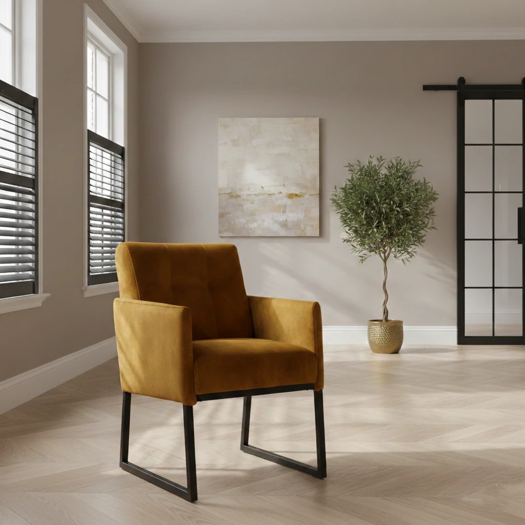 De armstoel Essen dichte arm straalt luxe en warmte uit door de velvet veloursstof Adore Gold. De armstoel heeft extra dikke vullingen in de kussens voor waanzinige comfortabele ondersteuning. De bekleding Adore Gold heeft een authentieke vintage look, voelt lekker zacht aan en ziet er classy uit. De armstoel Essen heeft een zwart metalen frame. Naast de stof Velvet Adore ook verkrijgbaar in diverse andere soorten stof of leder.
