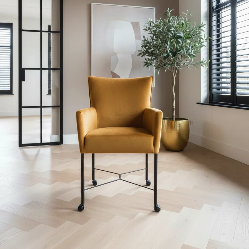 De moderne armstoel Fiore met Velvet Adore past perfect in een stoere eetkeuken of woonkamer. De stoel heeft een heerlijk gevormde kuipzitting die de rug perfect ondersteund. De zitting is opgebouwd uit een nozagvering met daarop een koudschuim HR kussen, welke heerlijk comfortabel is en vooral niet te hard zit. De bekleding adore velours is makkelijk in onderhoud en heeft niet veel onderhoud nodig”; schoonhouden met de stofzuiger is genoeg. De stoel kan ook met microleder worden bekleed, zoals het favoriete microleder Bull. De armstoel is op parketwielen die geschikt zijn voor de meeste harde vloeren en laagpolig tapijt.