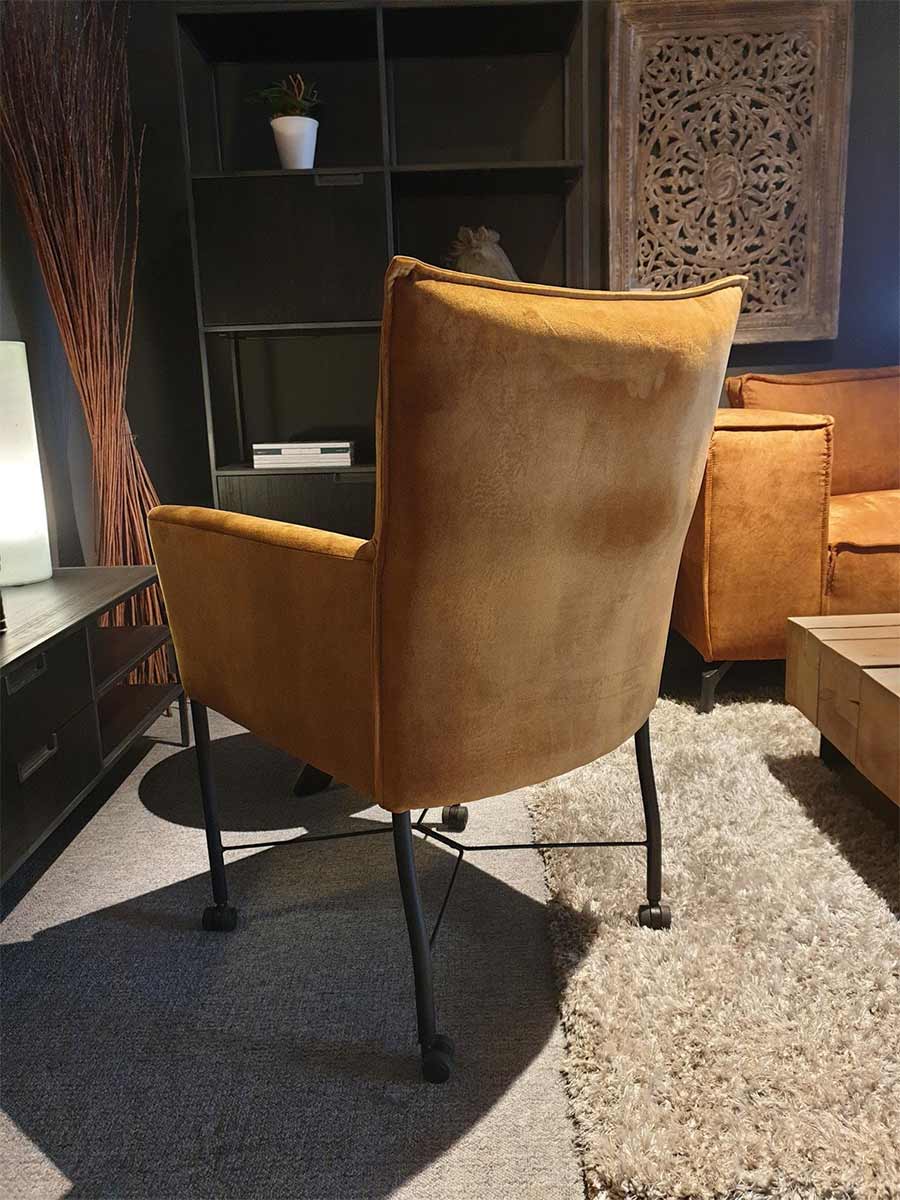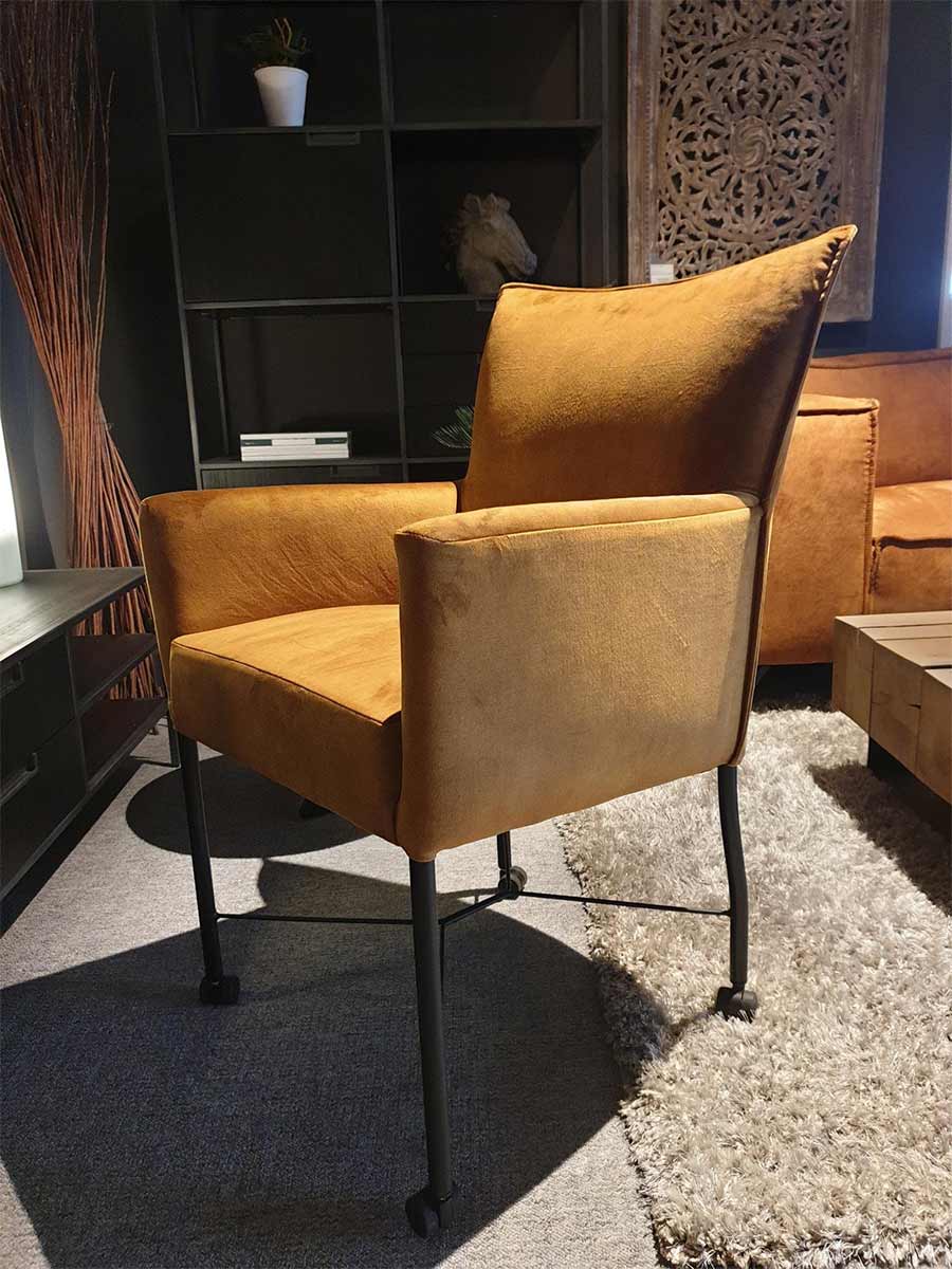 Moderne armstoel Fiore met het luxe velvet velours Adore cognac.