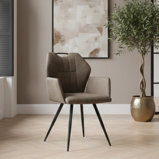 De armstoel Flare in met microvezelstof Zorro in de kleur taupe heeft een luxe uitstraling. De armstoel is uitgevoerd met een perfect gevormde kuipzitting dat zorgt voor een geweldig zitcomfort. Voor de bekleding is er keuze uit 6 kleuren stof: cognac, taupe, groen, antraciet, beige en lichtgrijs. Het sierlijke frame is gemaakt van metaal en is zwart gelakt.