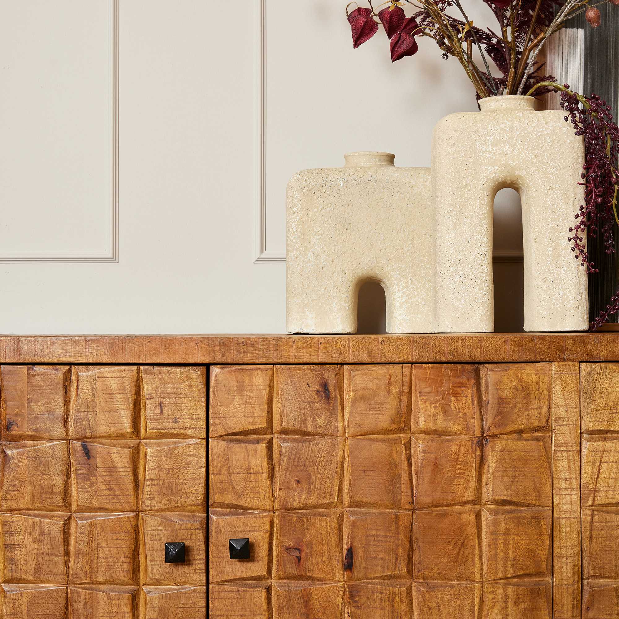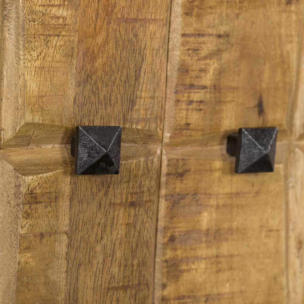 Het dressoir Brandy in naturel mangohout met industriële touch heeft een neutrale vormgeving en past in bijna elk interieur. De kast heeft een strakke indeling met 4 deuren. Achter elke deur zit een legplank. De subtiele metalen poten zijn zwart gelakt. Het dressoir Brandy is onderdeel van het woonprogramma Brandy, met veel kasten en tafels die je kan combineren. Uniek aan de serie Brandy is het uitgesneden blokken patroon in het hout.