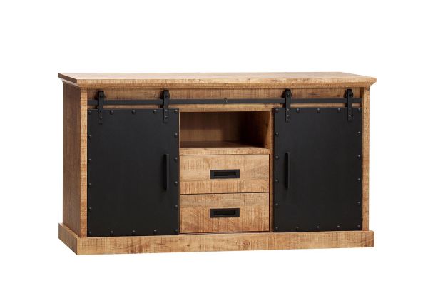 Het dressoir Rijssen mango 160cm met 2 deuren en 2 laden en open vak heeft een industriële look door de stoere zwarte mdf schuifdeuren. Toepasbaar in vrijwel elk modern interieur.