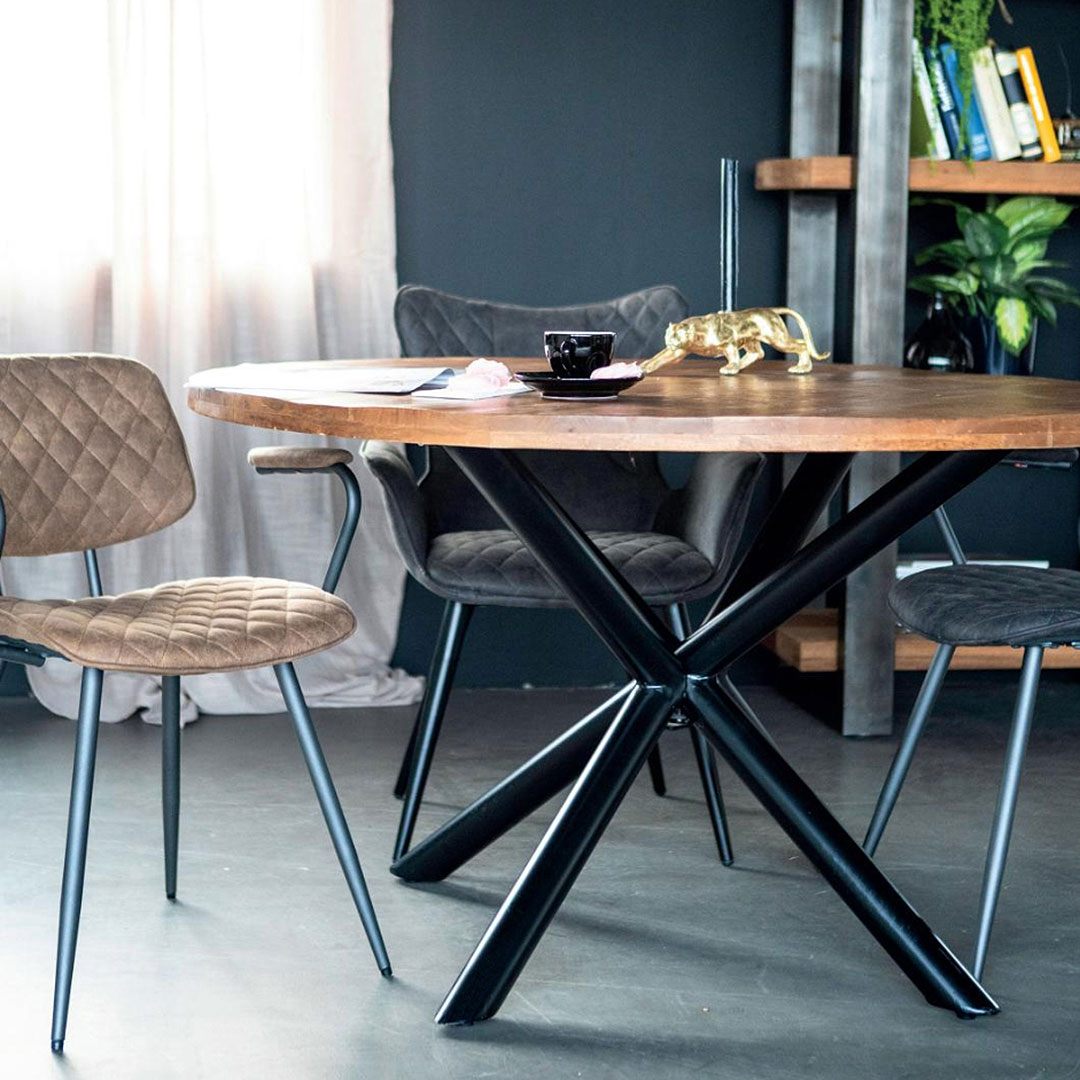 Moderne ronde eettafel van mangohout met zwarte metalen kruispoot.