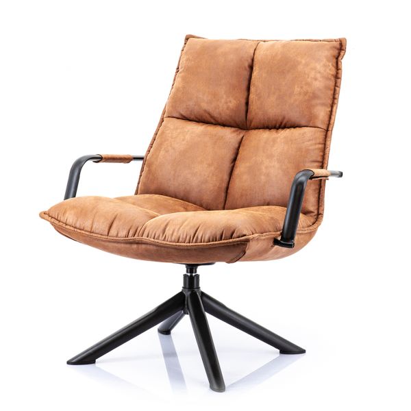 Zitten op de moderne fauteuil Mitchell topper cognac 996602 – Eleonora is genieten!. De draaistoel heeft een comfi zitting en is 180 graden draaibaar. De bekleding Topper heeft een echte vintage look, voelt lekker zacht aan en ziet er uit als een suedeleder. De fauteuil Mitchell heeft een zwart metalen buizenframe, waarvan de armleuningen zijn bekleed in dezelfde stof als de rug- en zitkussen.