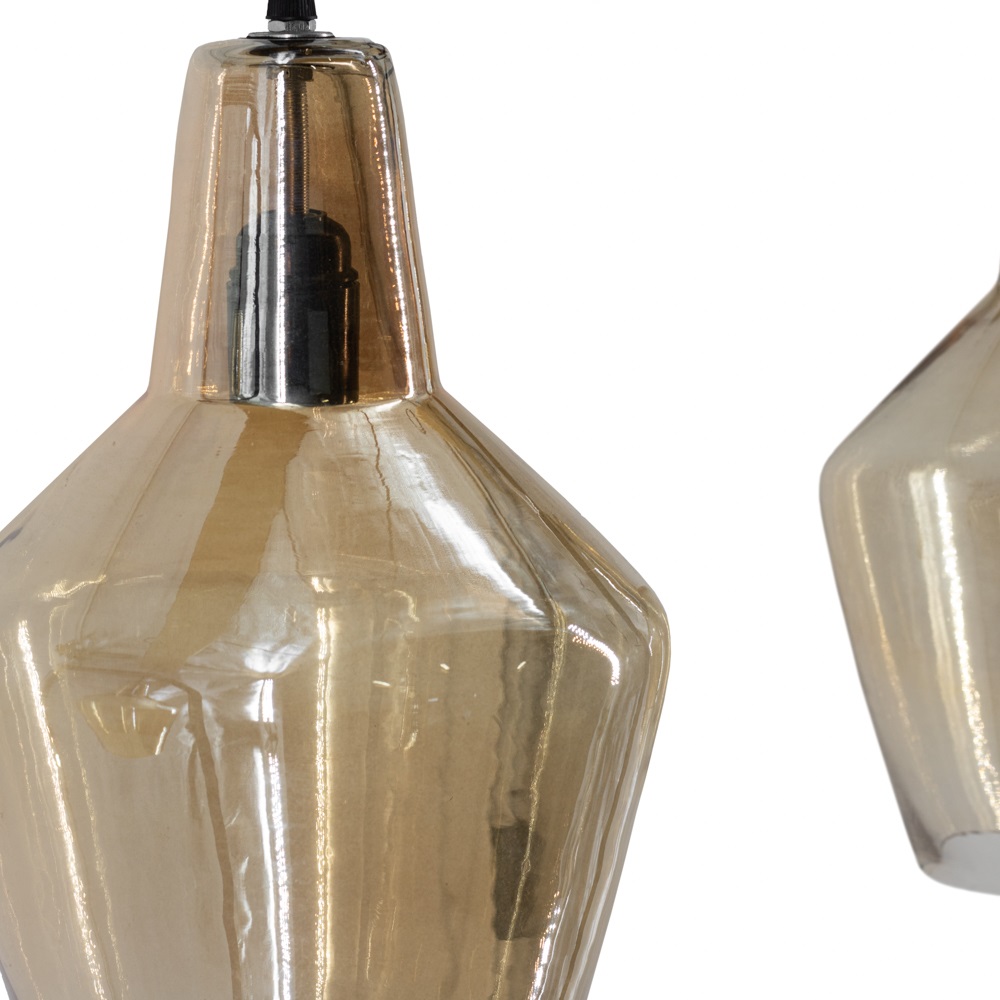 Exclusieve hanglamp met langwerpige ophangbalk in goudkleurig metaal en 3 glazen bollen met goud glas.