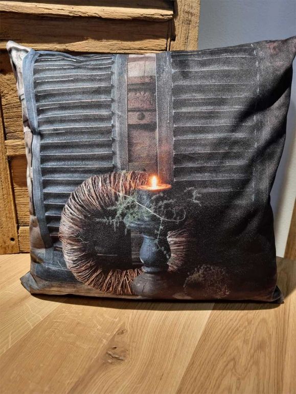 Sfeermaker – vierkant velvet kussen antraciet met stilleven, kandelaar en krans, inclusief binnenvulling.