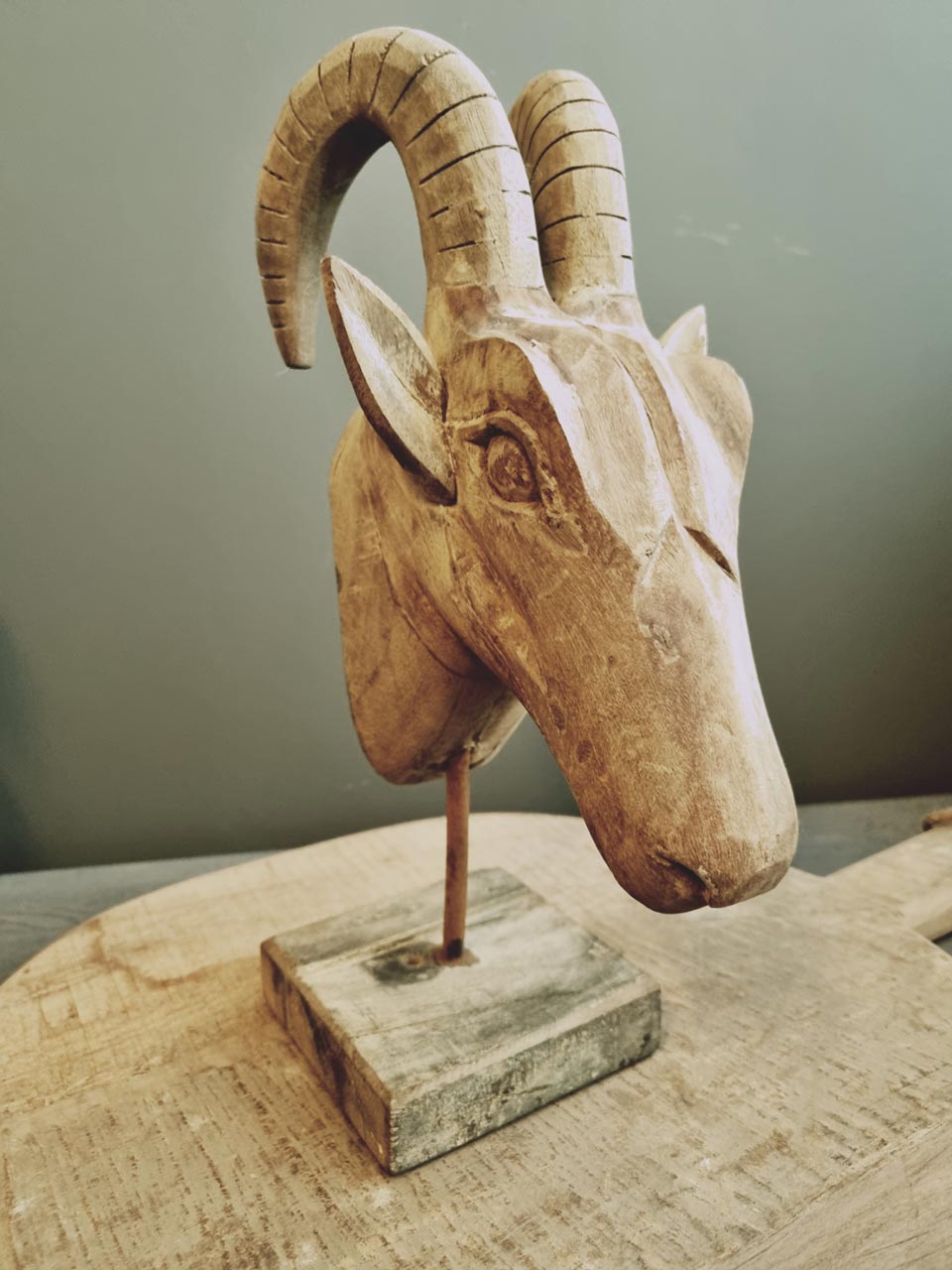 Oud houten geitenkop op standaard