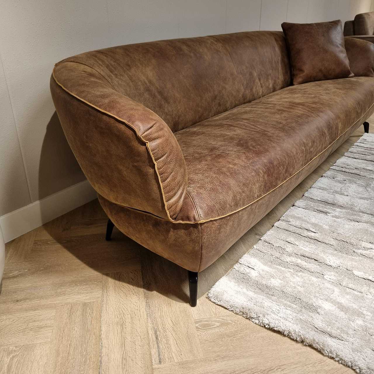 Deze bank biedt niet alleen hoog zitcomfort, maar ook een krachtig designstatement. De ronde vorm zorgt voor een vriendelijke uitstraling en brengt dynamiek in de ruimte. Dankzij het gebruik van duurzaam natuurleer geniet je bovendien van een lange levensduur en een karaktervolle veroudering van het materiaal.