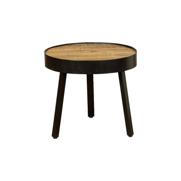 Gave ronde bijzettafel van naturel gelakt mangohout – 54cm – en zwart metaal – industriele stijl.