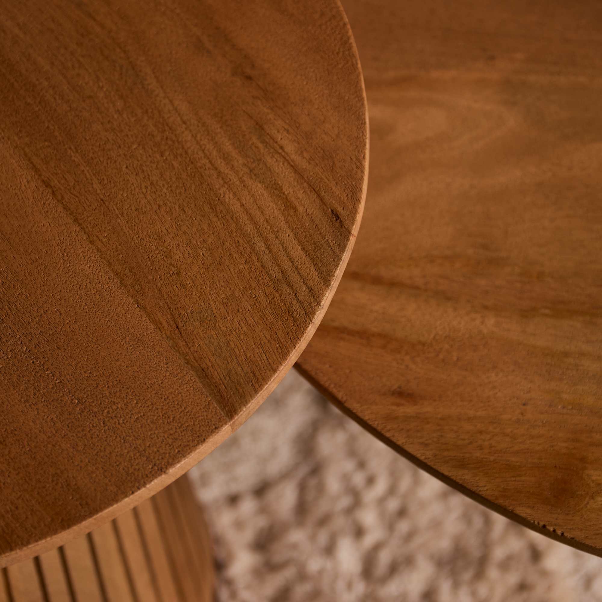 Het design van de Solana salontafel wordt gekenmerkt door het ronde tafelblad en de stevige poot met een verticaal lattenpatroon. Dit geeft de tafel een eigentijdse, luxe uitstraling en maakt hem een echte blikvanger in de ruimte. De natuurlijke houtnerf van het mangohout zorgt voor een warme, unieke uitstraling.