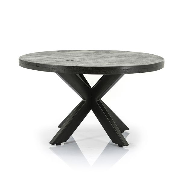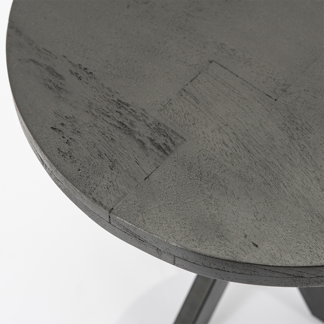 Gave ronde salontafel van zwart gelakt mangohout en metaal – industriele stijl.