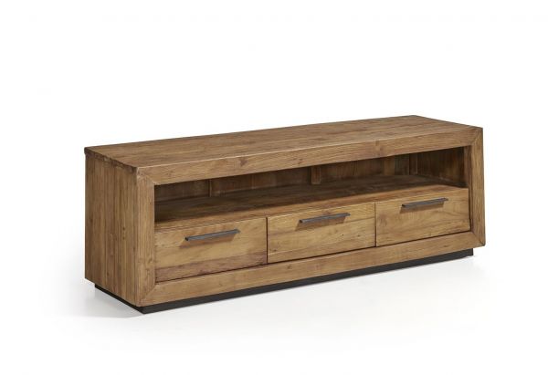 Het robuuste tv dressoir Apeldoorn teak 160cm met drie laden en een open vak past perfect in een landelijk interieur of een interieur in industriële stijl. Het tv dressoir Apeldoorn lijkt zwevend, doordat deze op een zwart gelakte houten plint staat. De laden zijn voorzien van zwart metalen handgrepen en lopen op metalen geleiders.