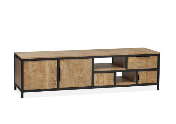 Het tv dressoir Delden klein mango groot met industriële touch heeft een neutrale vormgeving en past in bijna elk interieur. Indeling: 4 deuren 1 lade en 2 open vakken.