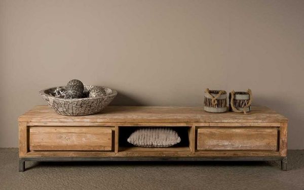 Stoere industriele tv dressoir 180cm breed – gerecycled teak in subtiele whitewash met metalen onderstel.