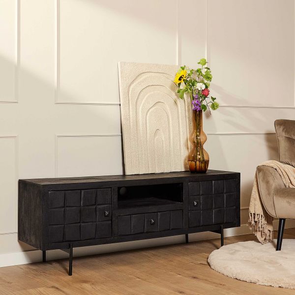 Het tv meubel Brandy 180cm breed in zwart gelakt mangohout met industriële touch heeft een neutrale vormgeving en past in bijna elk interieur. De kast heeft een strakke indeling met 2 deuren en 1 lade. De subtiele metalen poten zijn zwart gelakt. De tv kast Brandy is onderdeel van het woonprogramma Brandy, met veel kasten en tafels die je kan combineren. Uniek aan de serie Brandy is het uitgesneden blokken patroon in het hout.