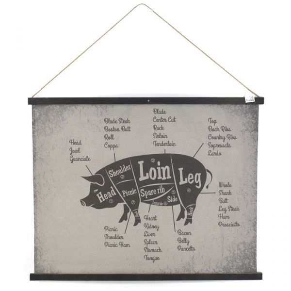 Deze unieke wandkaart met mooie afbeelding van varken met aanduiding van alle vleesdelen is een leuk item voor aan je wand! De wandkaart heeft mooie frisse kleuren en is keurig afgewerkt met zwarte houten balken. De kaart past perfect in de woonkamer, keuken of bijvoorbeeld slaapkamer. De wandkaart is voorzien van een touw waarmee je deze kunt bevestigen aan de wand, en is passend in elk interieur.